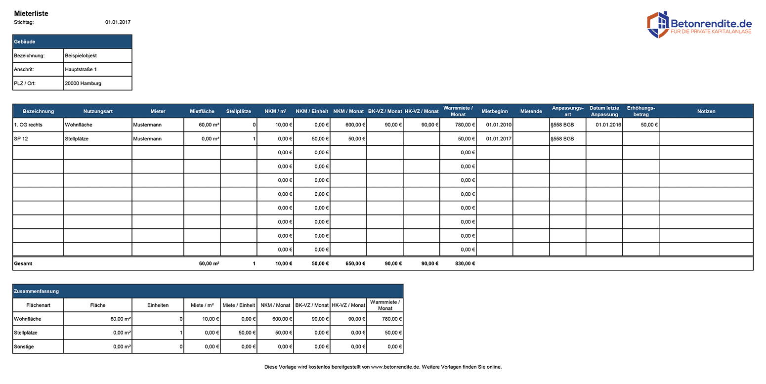Mit dieser Vorlage können Sie alle bestehenden Mietverträge für ein Mehrfamilienhaus zu einer vollständigen Mieterliste zusammenfassen und aufbereiten. Die Datei verfügt über mehrere Tabellenblätter für 10 oder 20 Mietverträge.